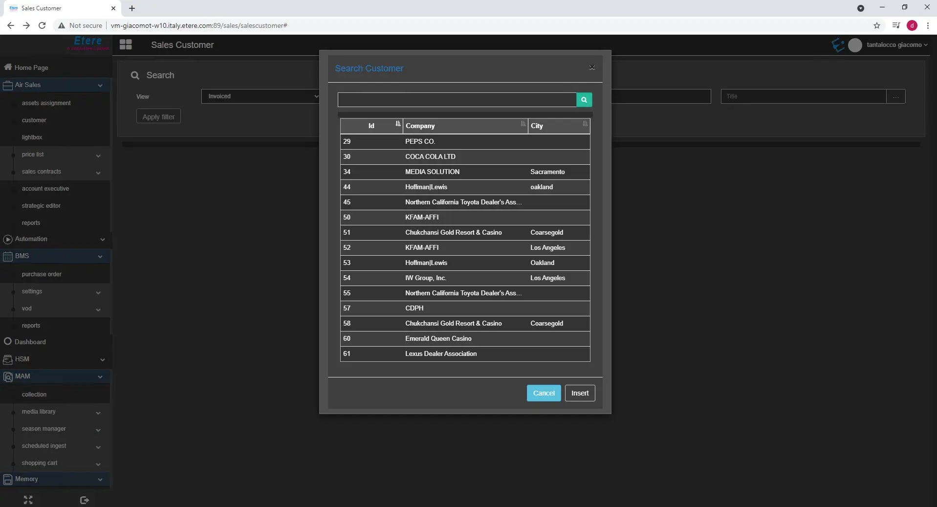 You can enter a customer name in the text box to begin the search; once the customer is detected, the customer ID and Company name will be auto-retrieved from a database table. Click <Insert> to insert the customer data for filtering.