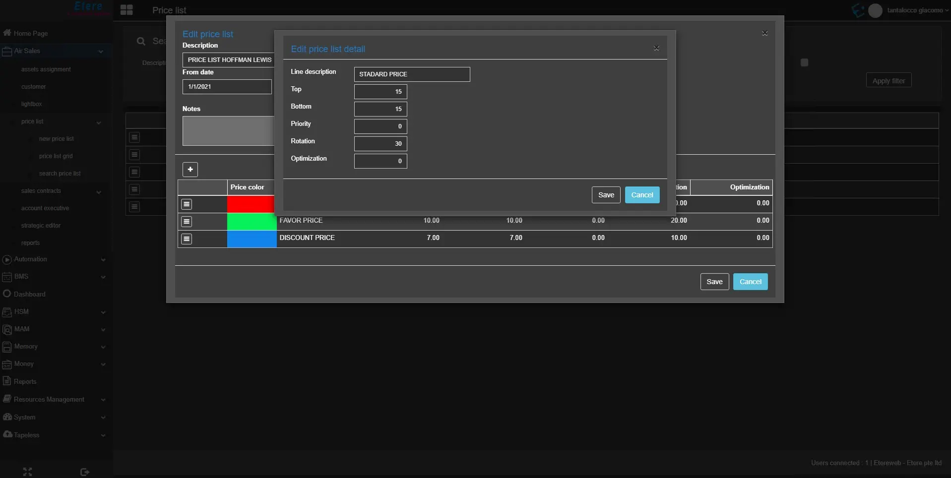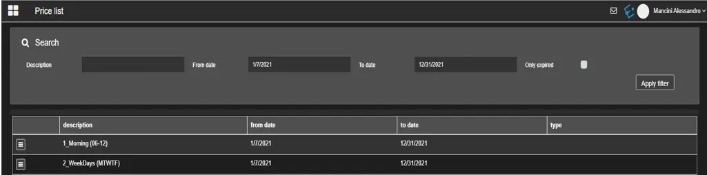 The Edit function allows the operators to edit a Price List on the fly, direclty from the Search Price List view;