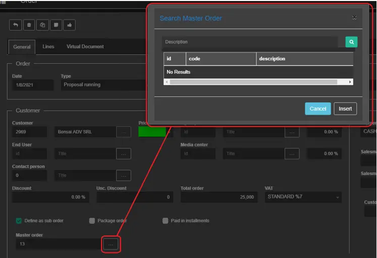 Define as sub-order: You can enable this option to define the current Order as a sub-order. After explaining, the operator can link the sub-order to a Master Order by filtering the Master Order Code as indicated below;