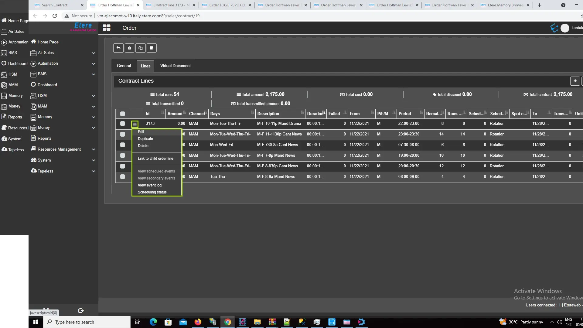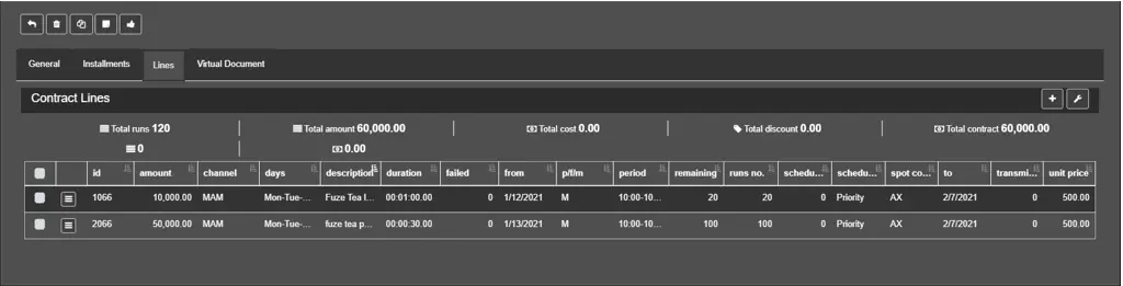 Linesare part of an order that describes the terms, conditions and costs of broadcasting specific billable content. In this tab are listed all the lines linked to a particular contract.