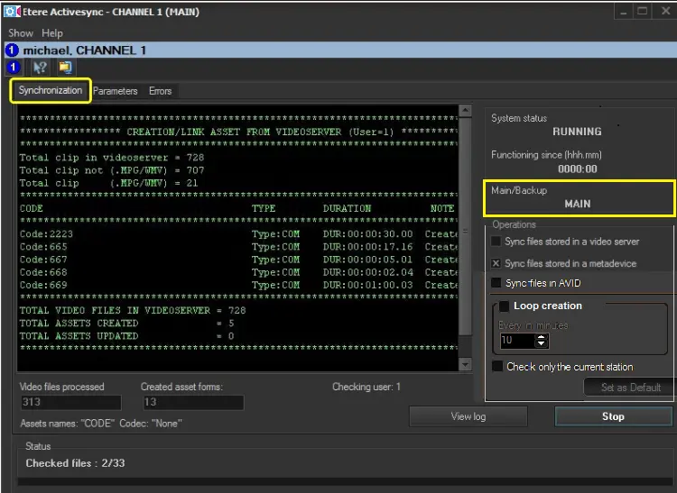 The main/backup mode allows two instances of Etere ActiveSync to run on different computers to increase the redundancy of the synchronization process, making the backup system capable of replacing the main one if it stops running.