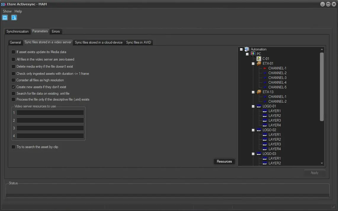 This section allows the configuration of parameters for synchronising high-resolution video files (e.g. mxf, DV, etc.) stored in specific video server(s). It also allows synchronising low-resolution video files (e.g. WMV, mpg, etc.) and subtitles/captions files (e.g. STL, SCC, etc.). The following options are available in this section: