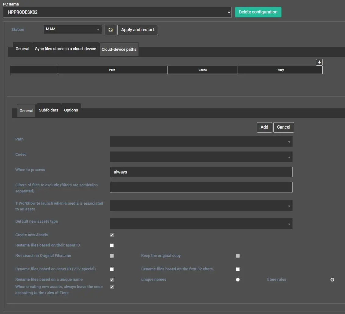 • Asset code renaming: If any of the renaming options is selected, indicate if the new asset's code should be created as unique names or following Etere rules.