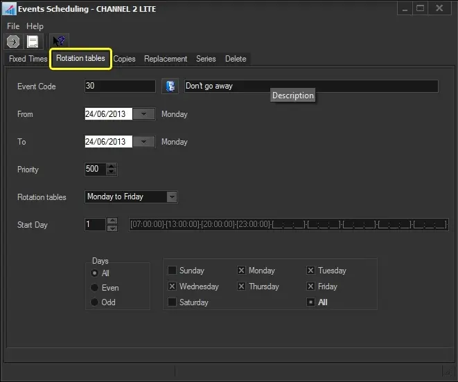 To start rotating an event, search for it using the [Event Code] button and then compile the following parameters: