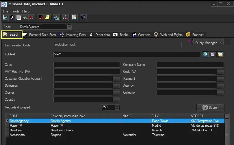 Use the "Search" tab each time you need to browse or edit existing personal data; this window allows you to search for existing companies or persons matching or containing the following filters:
