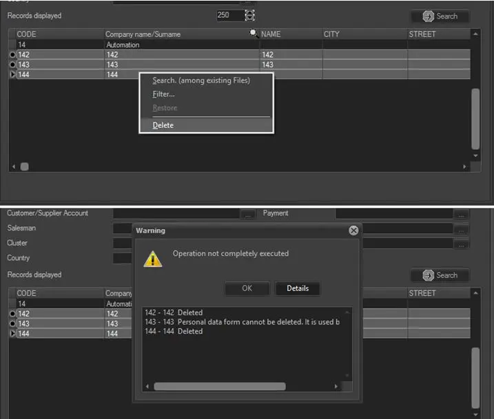A warning message may be displayed if the operation(s) is not entirely executed. For example, data may be retained when it is in use.