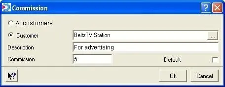 3. It will be possible to insert a brief description of the current commission and the commission value itself. By unchecking the 'Default' option, the recent commission will be used if various commissions have been specified for the same customer. After all these fields are compiled, click on the 'OK' button to finish the insertion: