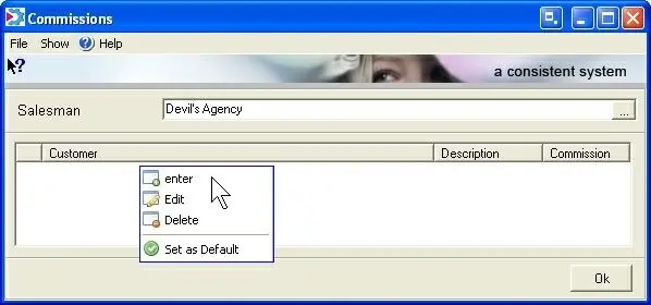 2. Once selected, all existing customers associated with the current Account Executive will be listed in the bottom section. To specify a new commission, right-click and click on the 'enter' option; a window will enable you to assign a commission for: