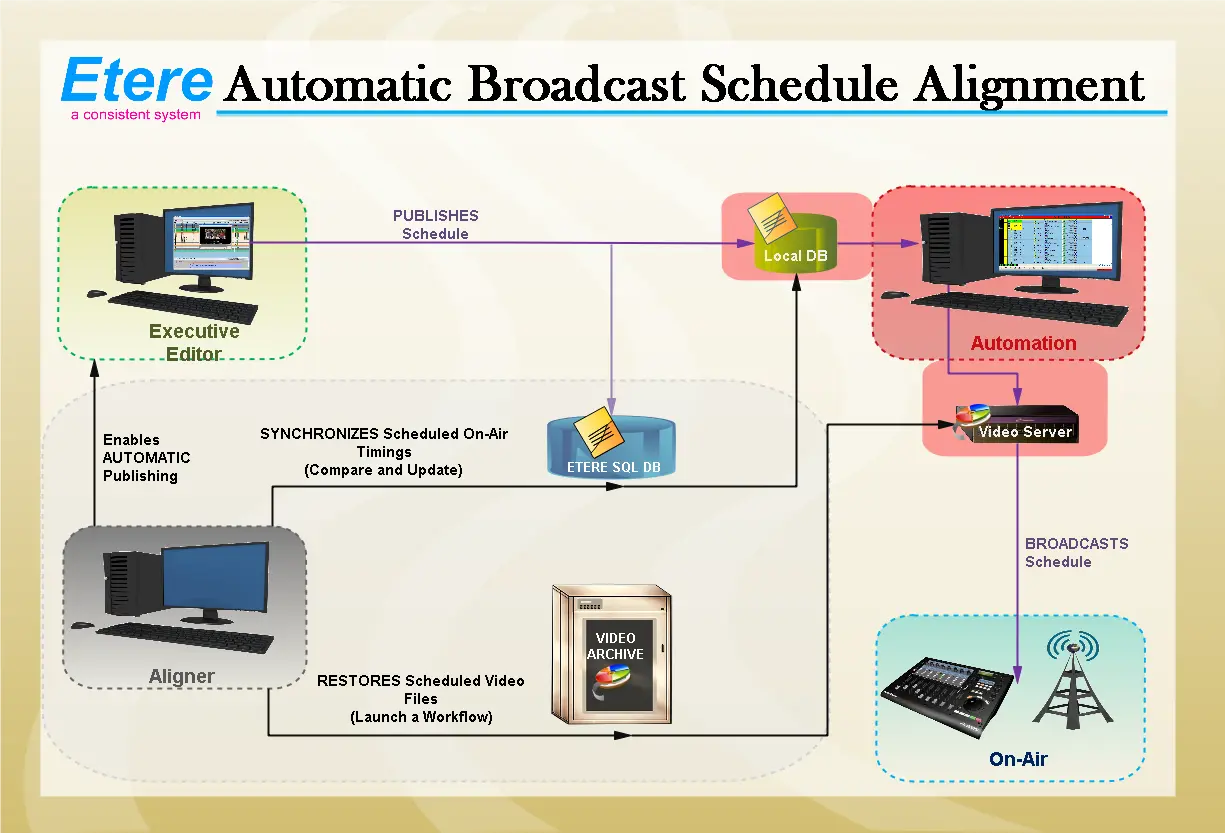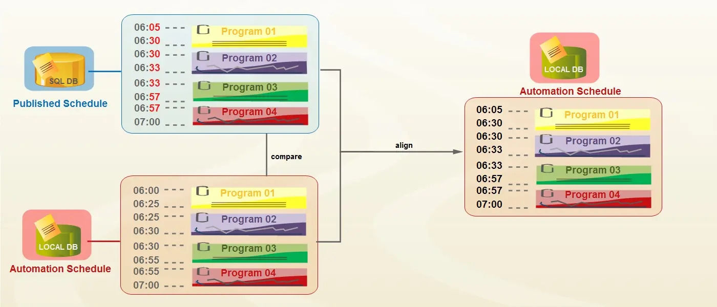 Etere Aligner is an application that keeps the published schedule (stored in the SQL database) constantly synchronized with the automation one (stored in a local independent database); this is important as broadcast timings can vary from those in the published schedule: