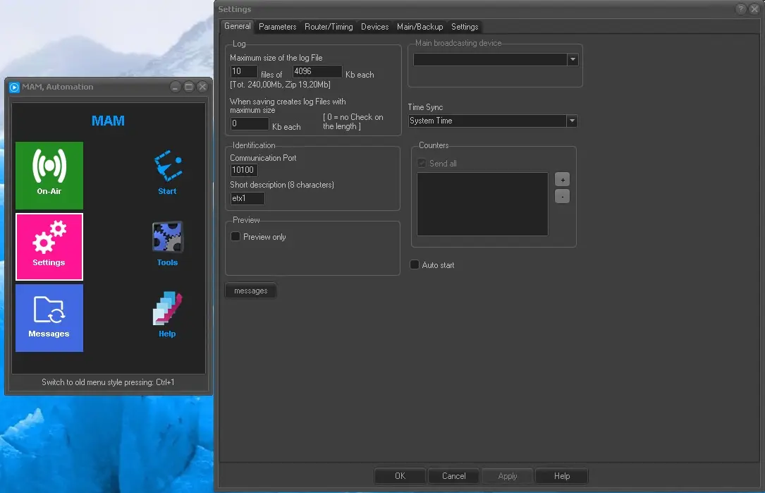 The Settings window allows you to customize the way Etere Automation works; its parameters are divided across different tabs, including General, Parameters, Router/Timing, Devices, Main/Backup, Customize Colors and Columns: