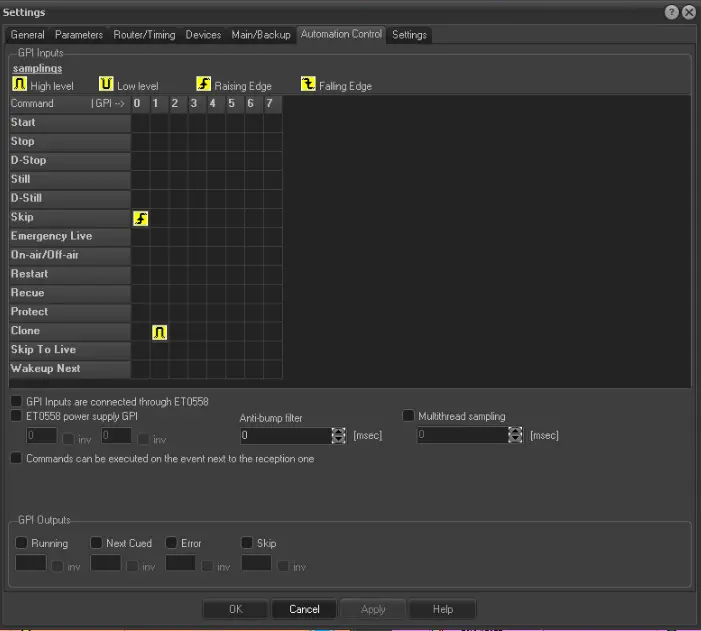Multithread sampling (msec) - If enabled, the automation will sample GPI signals using a separated thread based on the frequency specified here (in milliseconds).