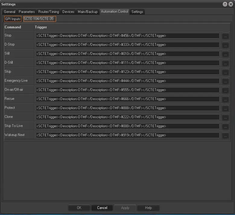 SCTE-104/SCTE-35 triggers to be detected and associated with automation commands such as, for instance, SKIP, SKIP to LIVE, STOP and can be configured in: