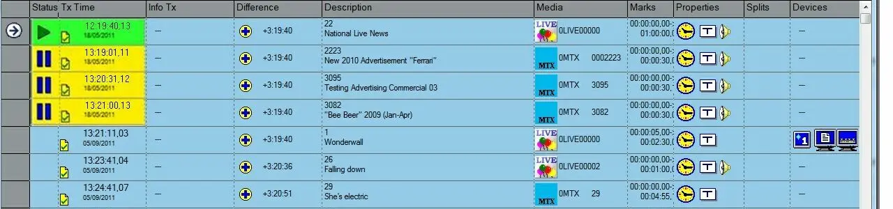 The Events grid window comprises the same number of rows as the number of events composing the broadcast schedule. Each column shows different properties and data about each event. The description of each column (from left to right) are: