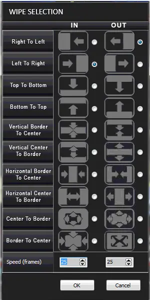 In the Wipe Selection dialogue, you can define the wipe effects by selecting the wipe directions buttons on the left and clicking the IN or OUT bullet points on the right pane. After which, you can set the wipe effects' speed by entering the frame numbers (per second) in the bottom pane. Once the selection is confirmed, click <OK> to apply the wipe effects.