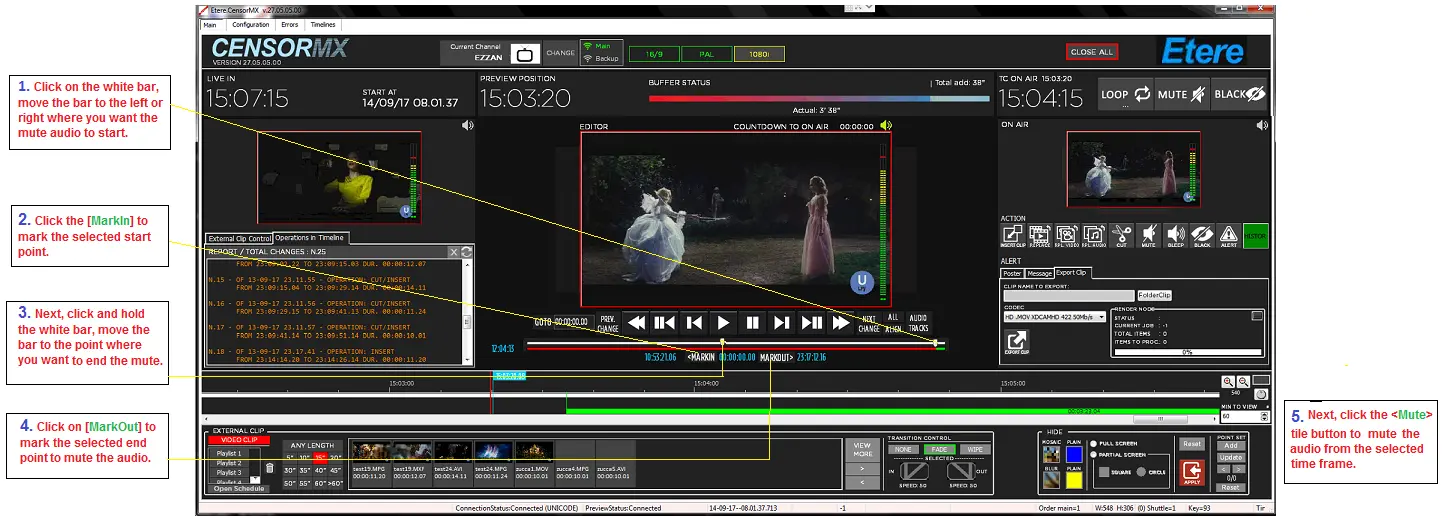 How to mute audioTo mute the audio of the playout clip, follow the steps illustrated below.Censormx_editor_mute_audio