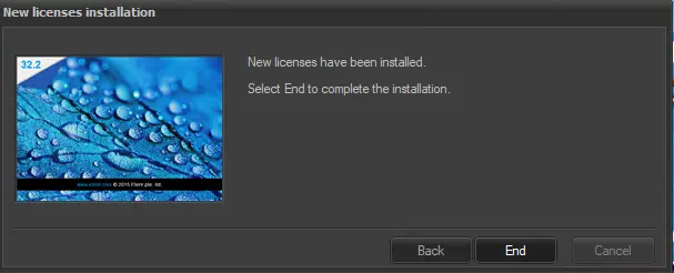 3. The license installation takes a few seconds and when it's complete the module prompts a confirmation message. Click <End> to exit from the installation program.