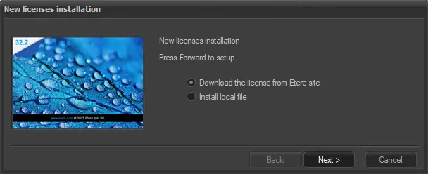 1. From the New License Installation dialog box, select “Download the license file from the Etere site” and click <Next> to continue.