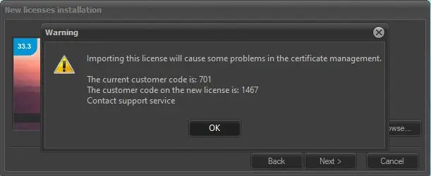 When a user attempts to install a license with a different code, the following alert is displayed, warning the user about the change.