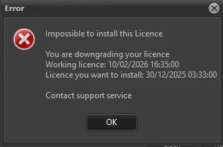This error appears when the license file you're trying to import is older than the one currently installed. The message in the image, for example, says the license already installed was made on 10/02/2026, while the one the user is trying to install was made on 30/12/2025, and Etere does not allow this operation.