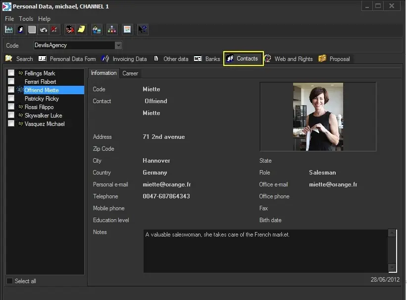 Information - Display all the relevant data retrieved for the selected contact (i.e. Code, Name and Surname, Address, City, Email, etc.). The only field editable from this tab is the notes field.