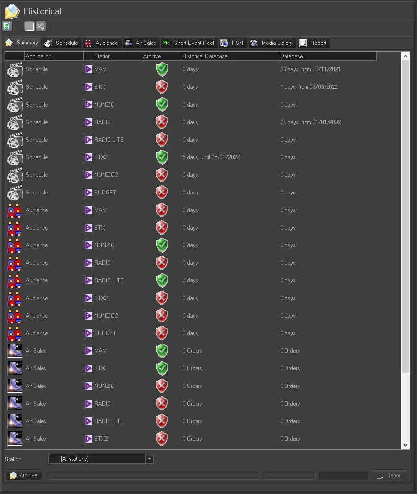 First of all, in order to archive data inside the historical database, the related section among the six tabs mentioned before (Schedule, Audience, Air Sales, Short Event Reel, HSM, Media Library) must be properly configured. Once all the needed parameters, for the desired stations, have been set and saved, the archive operation is executed by selecting first a specific station or all of them in the lower part of the Summary tab, then pressing the [Archive] button.