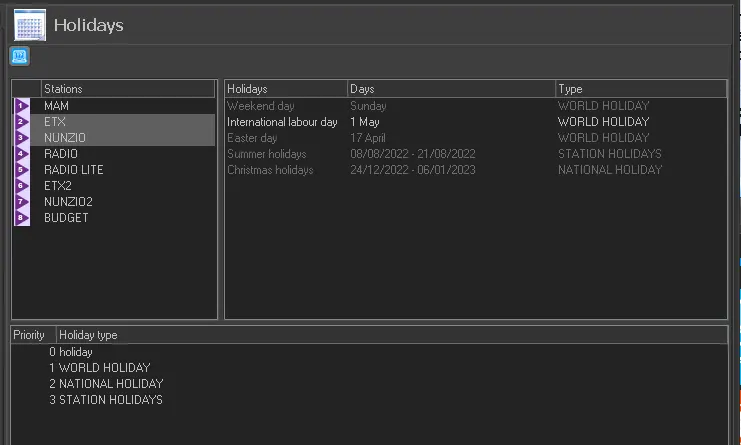 By default, holidays are specific for each station, but it's possible to contemporaneously select various stations to create holidays on all selected stations: