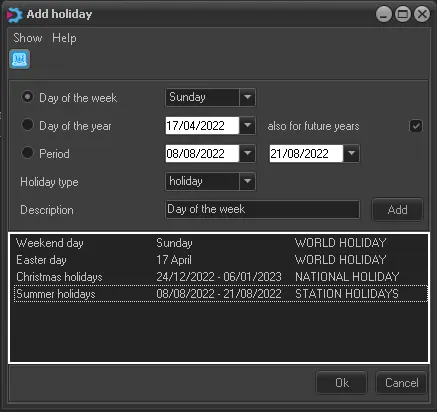 Once defined, press the 'Add' button to insert the holiday into the list; more holidays can be inserted at once from the insertion form. Once completed, press the 'Ok' button to save it into the holiday list.