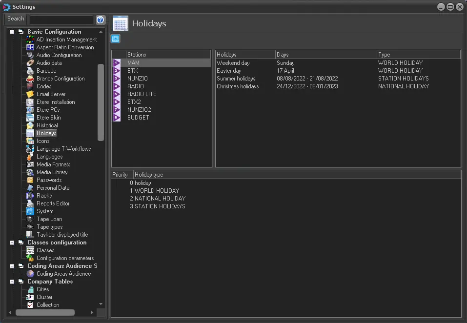 The Holidays section allows setting, for each station, specific dates as holidays to manage a 'holidays calendar', such as applying different time slots for Parental Guidance (Executive Editor | Parental Guidance) depending on whether the day is a working day or a holiday.