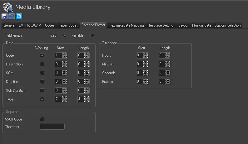 For instance, each time the operator uses the 'create tape from barcode' function from Media Library, the tape data will be automatically retrieved from the barcode based on the parameters set in Etere Configuration: