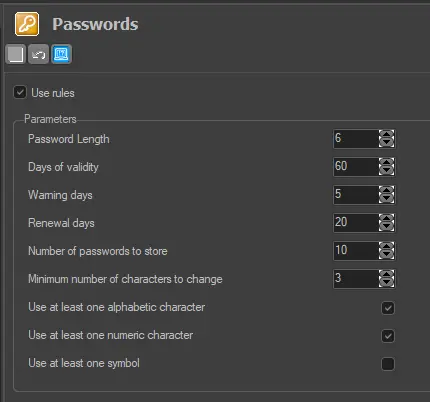 Use Rules: If enabled, the password management will be based on the criteria defined below. - Default: enabled