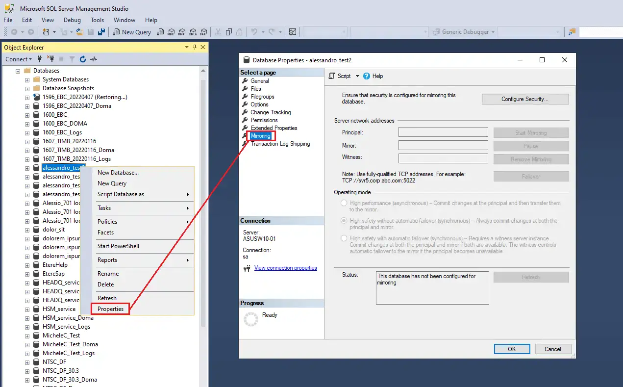The two databases specified as main and recovery databases must be installed in two SQL Servers with the same version. Moreover, these databases must be set in "full recovery mode" (not simple mode) and mirrored, as shown in the example below: