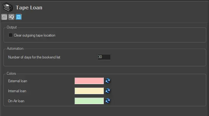 The Tape Loan section allows to set relevant parameters regarding the internal, external and on-air loan of tapes:
