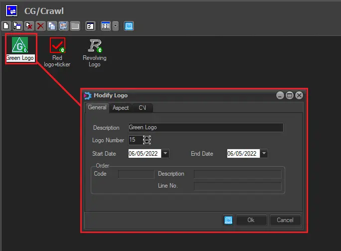 Insert, or modify the Description and Logo Number. You must associate a Start Date and End Date (an expiry date) to each Character Generator. All elements that have the expiry date before the current date will be deleted through the' Delete Expired' function.