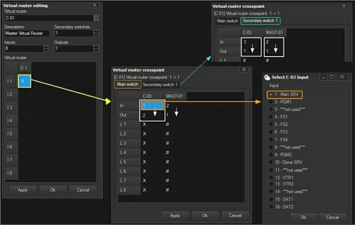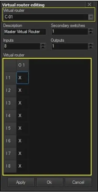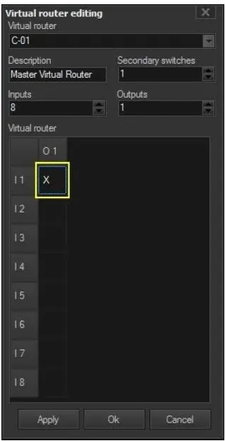 5. In the Virtual Router Table, double-click on a cell (e.g. I1,O1) to define the main switch (and eventual secondary switches) to be triggered when virtual switching occurred:
