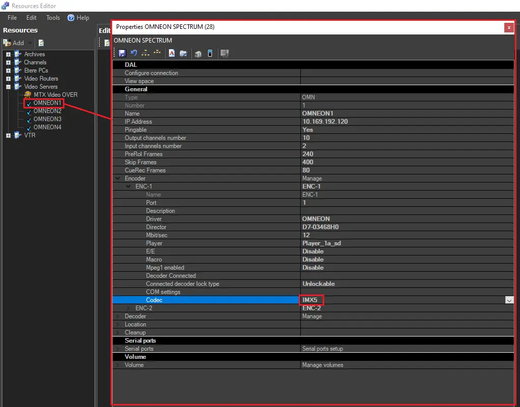 iii. Right-click and select the "properties", set the "codec" to the new codec (e.g. IMX50):