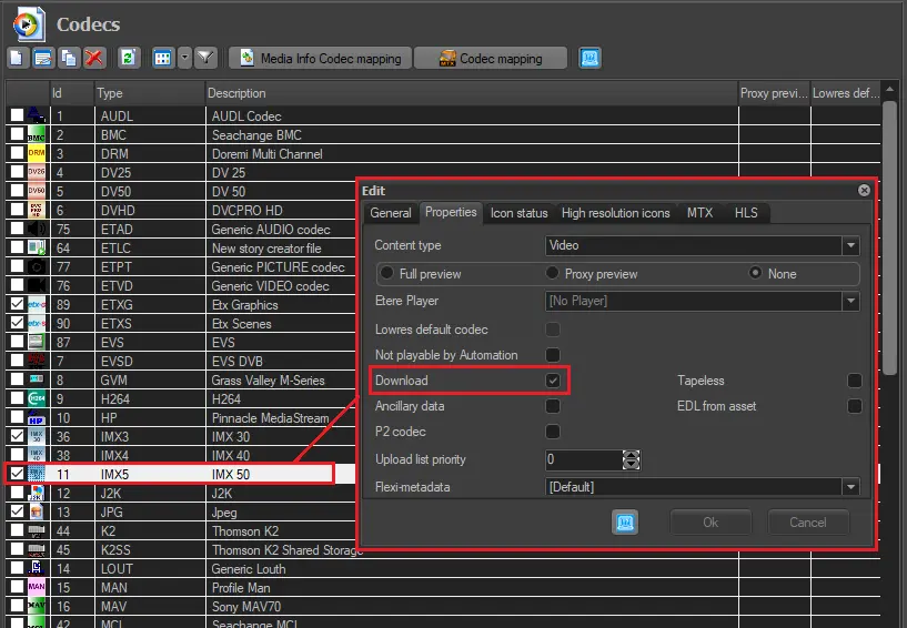 Open the "Etere Configuration > Settings > Device Settings > Codecs" section and activate the new codec (e.g. IMX50) ensure to enable its "Download" option: