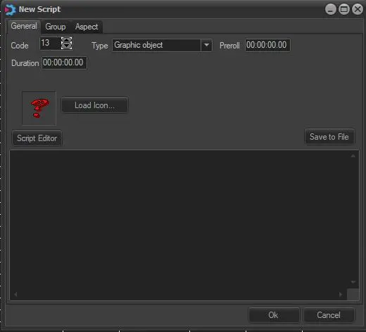 Script files must be written in a text editor and saved like normal files inside the Etere directory, only if used by the secondary event "Begin/end graphic objects".