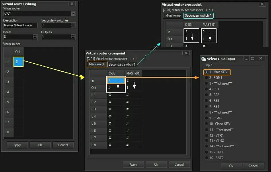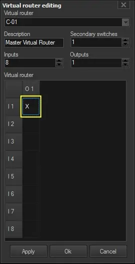 5. In the Virtual Router Table, double-click on a cell (e.g. I1, O1) to define the main switch (and eventual secondary switches) to be triggered when virtual switching occurs: