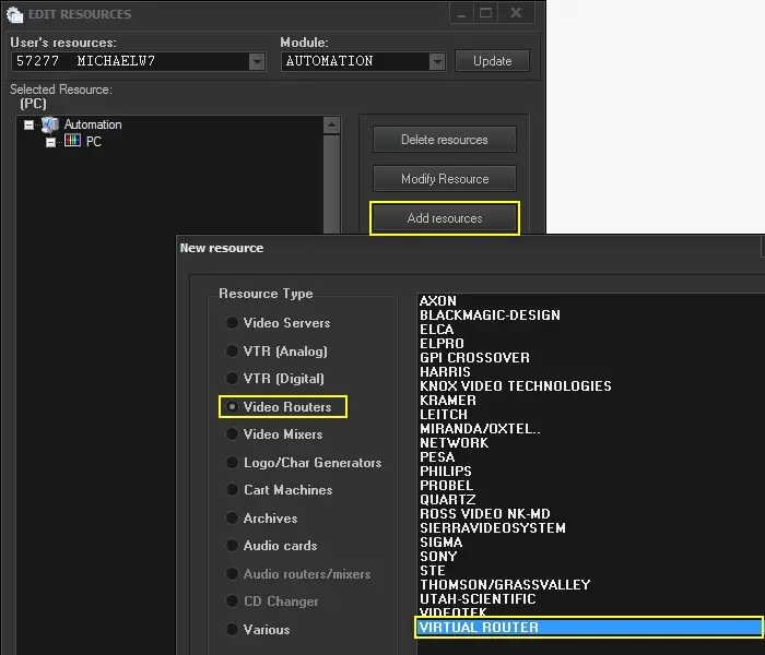 1. Open the Etere's Configuration > Resources module, press [Add Resources] and select the virtual router(s) from the Video Routers category: