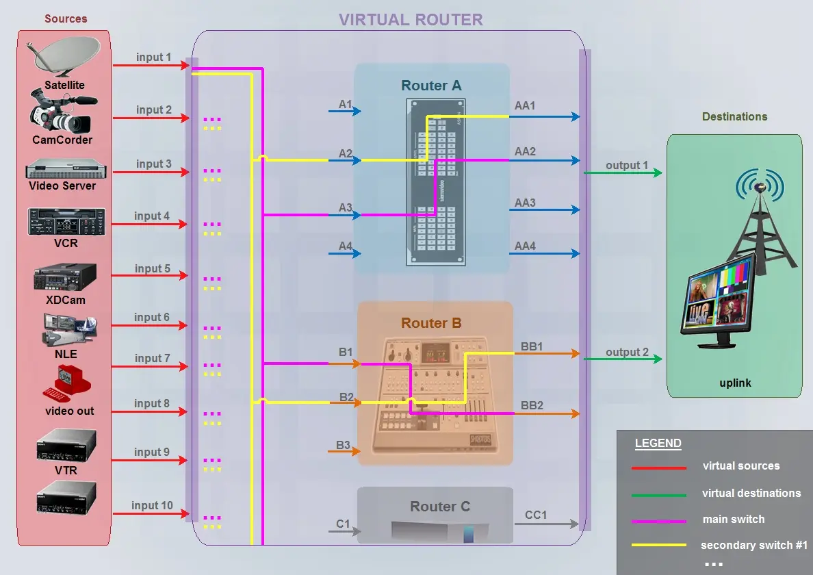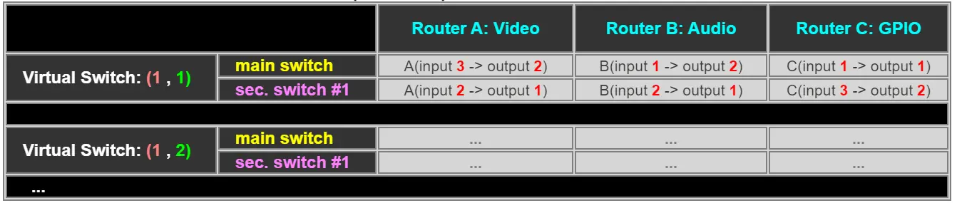 A virtual router improves the switching capabilities of the router, defining individual virtual switches to trigger multiple switches across one or more routers. The diagram below illustrates a virtual router formed by 3 physical routers, configured with 10 virtual inputs and 2 virtual outputs, enabled with a main virtual switch (for main devices) and a secondary switch (for backup devices):