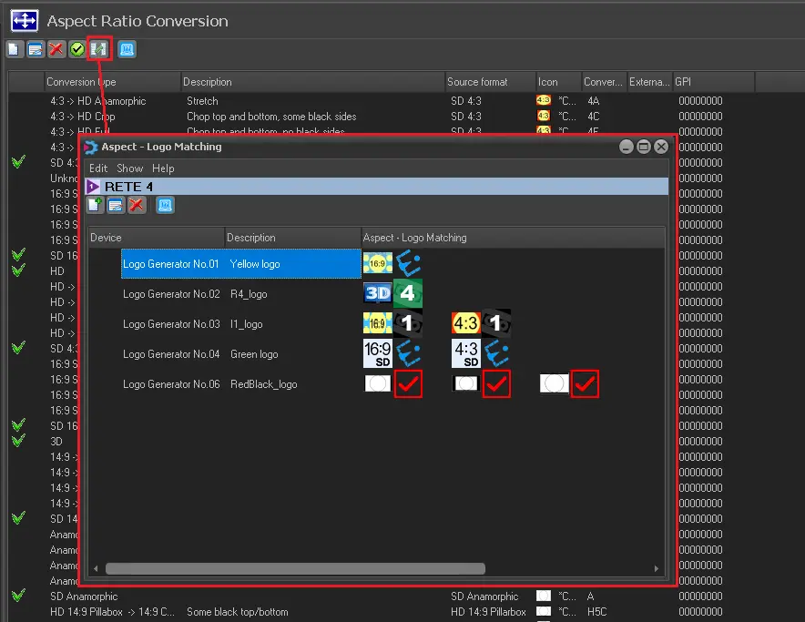 The [Logo matching] button allows mapping different logos of one or more Logo Generators to the playout aspect ratio.