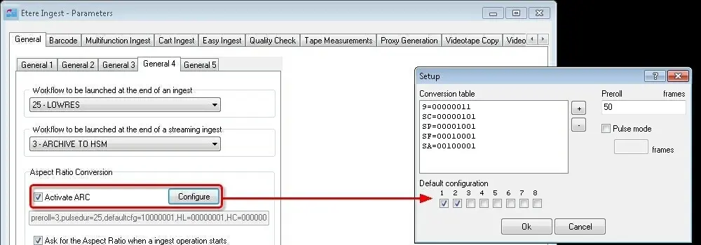 Etere Ingest allows configuring GPI signal combinations to trigger (e.g. on an external device) the ARC profiles that will convert the aspect ratio of a media for previewing ingested assets. This feature can be enabled and configured under the Etere Ingest > Parameters > General 4 section as described in the following instructions:
