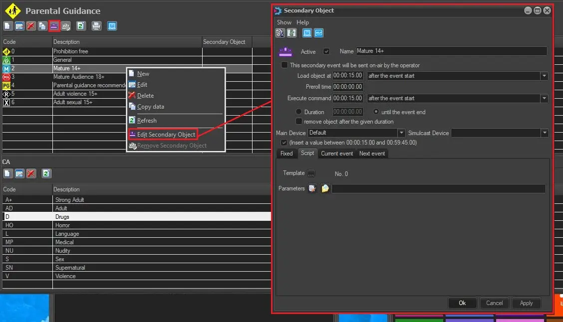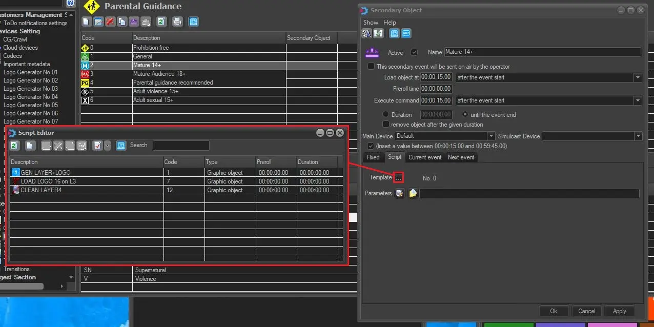 In Parental Guidance, you can assign a STMan logo to the secondary object for any parental rating; the inserted logo would be displayed from the start of the scheduled duration for identification in the Executive Editor.