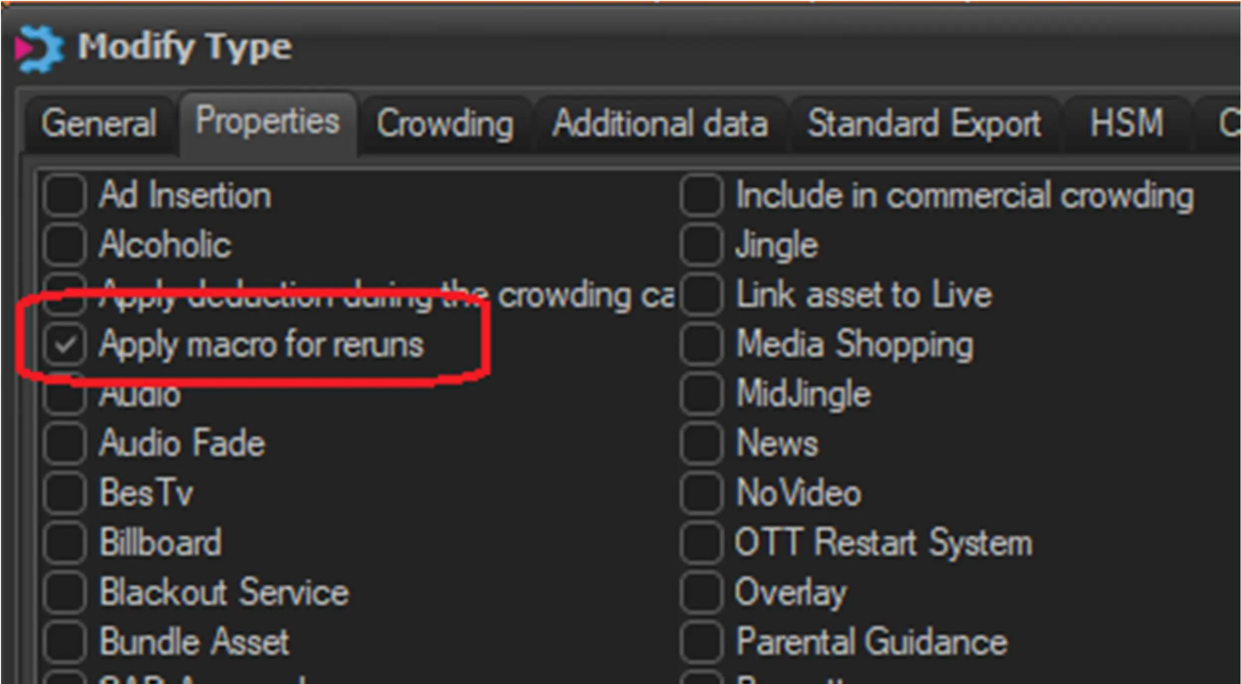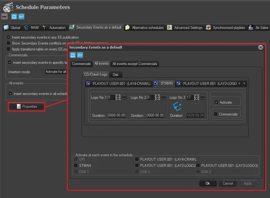 • Properties: The Properties form allows specifying the devices (e.g. CG Crawls, Logos) to be automatically activated for commercials, All events, or All events except commercials.