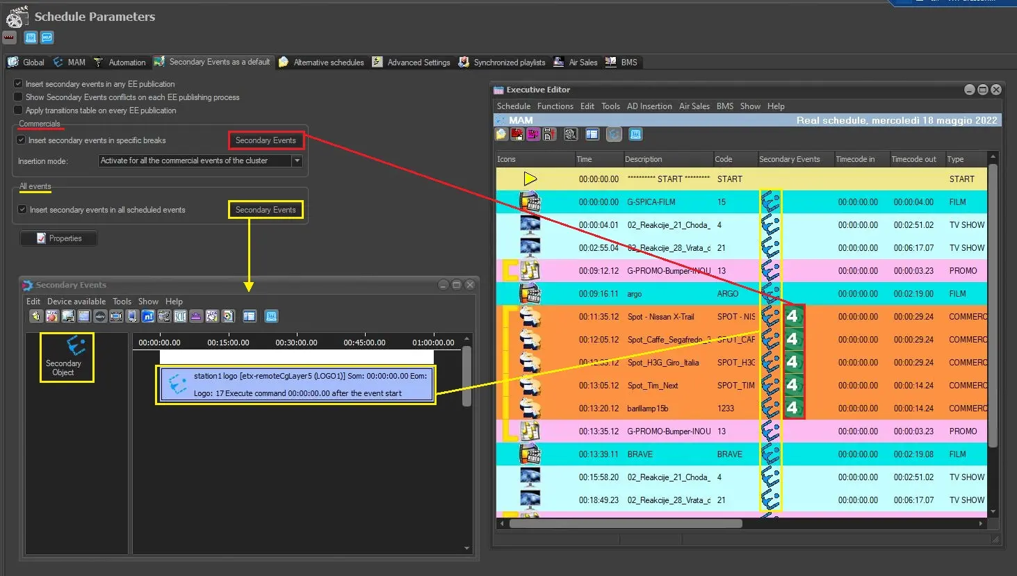 The Secondary events as a default section allows setting the STMan secondary events that will be automatically applied to commercial (and non-commercial) events scheduled for broadcast. The following figure illustrates the automatic application of secondary events to a schedule: