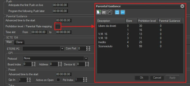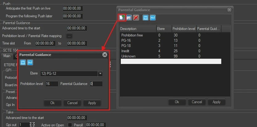 • Advanced time to the start: Specify the time in advance to air the parental rating event.