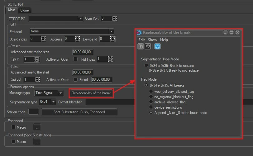 Replaceability of the break: This function allows you to notify the substitution of the break. Click on the function button to launch the dialogue and select ONE of the following operation modes to manage the break in the program: