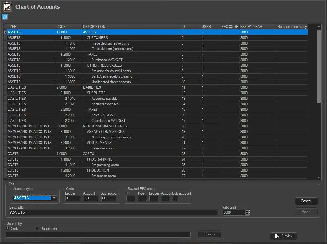 For detailed information on configuring your Chart of Accounts, please refer to the Etere Money > Chart of Accounts chapter.