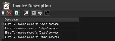 The Invoice Description section defines detailed invoice descriptions used across invoices compilation. To create a new description, click on the 'New' button and input the required description:Invoice_Descriptions