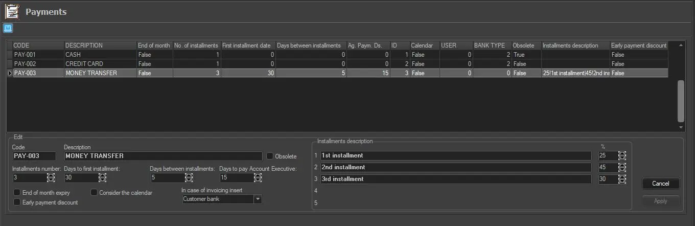 The Payments section allows configuring the payment methods used in commercial orders. Other than the user-defined code and description, specific information about the payment method can be specified: